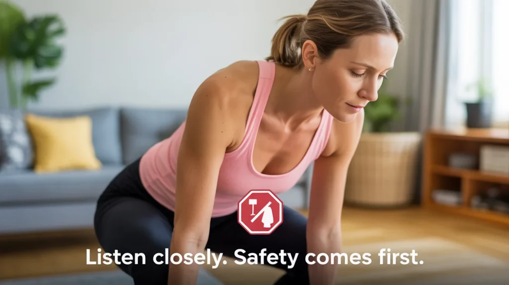 • Listen to Your Body: Pay close attention to signals like pain, dizziness, or shortness of breath. Stop immediately if something doesn’t feel right.